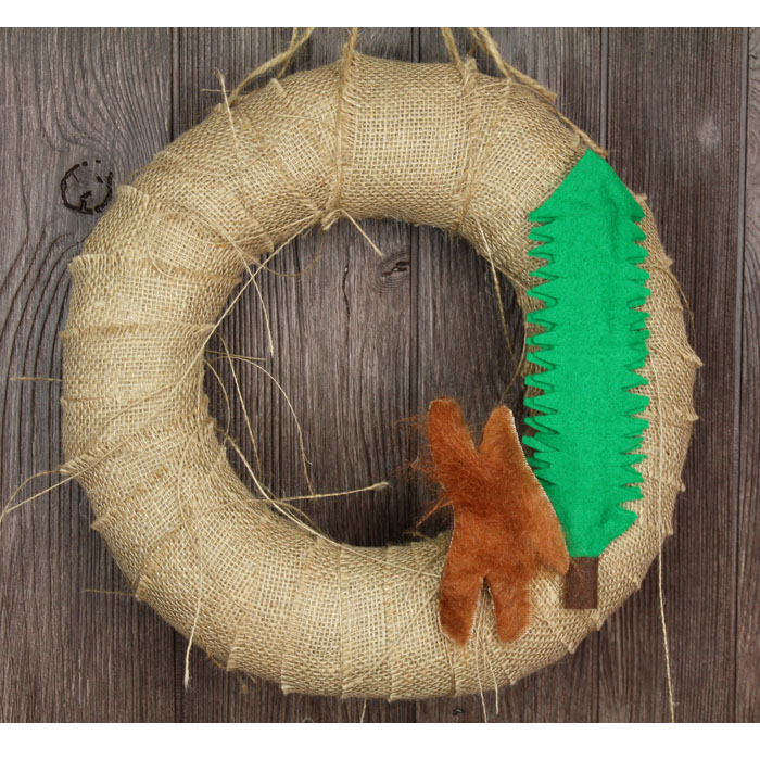 Above is the original design for Bigfoot wreath. Just Bigfoot waving hello, hanging out with Tall Green Tree. Placed on a 12″ burlap wrapped wreath. I’ve since stopped making this wreath and have moved on to other incarnations of Mr. Sasquatch.